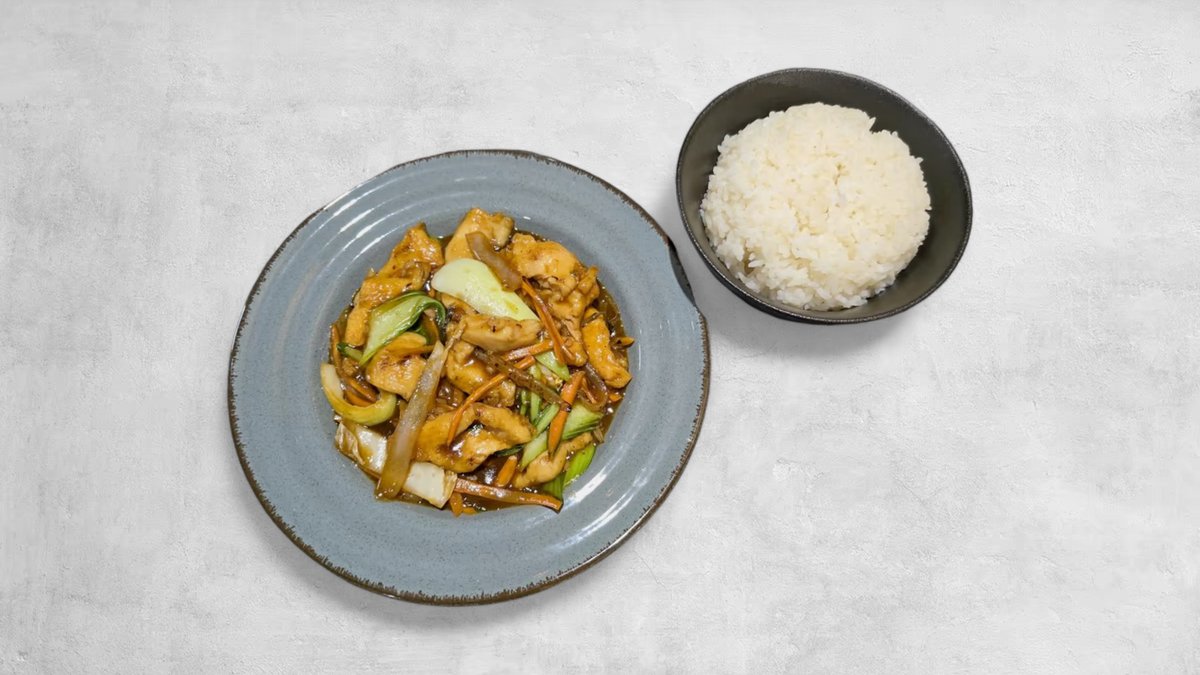 Välj mellan fläsk med grönsaker eller kyckling med grönsaker. Sweet chilisås ingår.