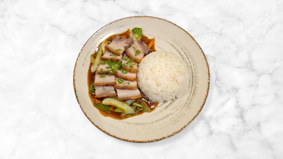 Krispig sidfläsk med ris och grönsaker. Sweet chilisås ingår.