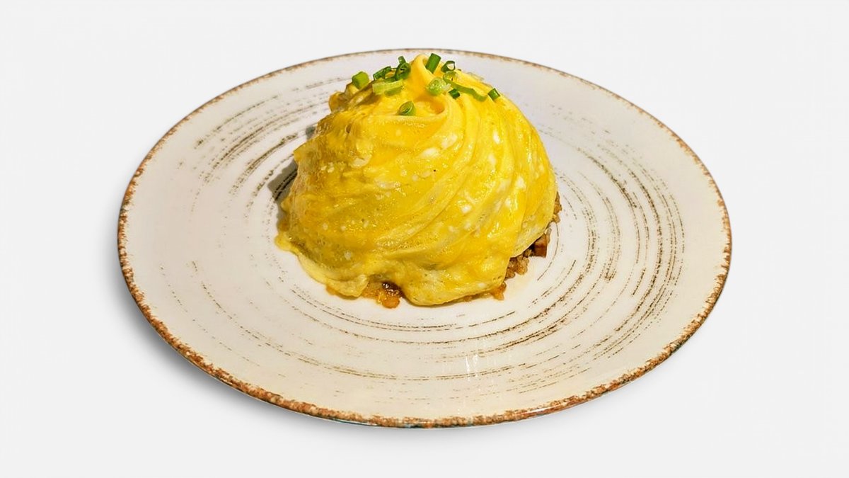Stekt ris med kyckling eller tofu, toppad med omelett.
