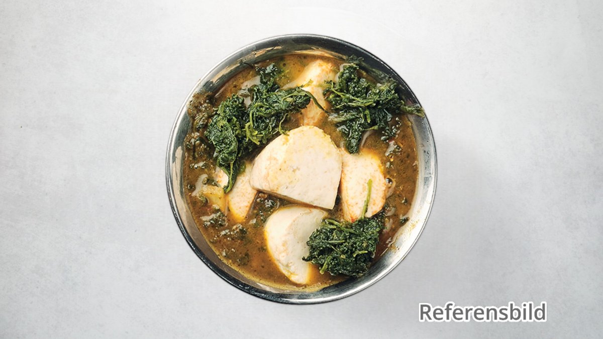 Palak spenat, tofu, grön chili, ingefärsskiva och hemlagade indiska kryddor.