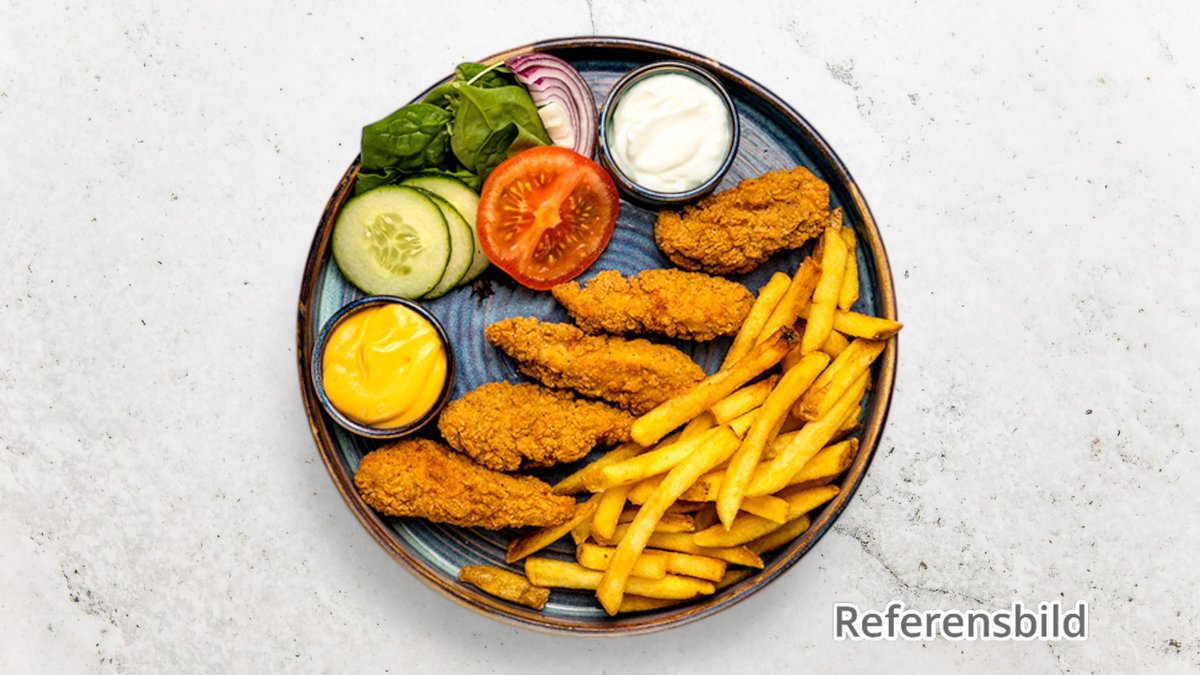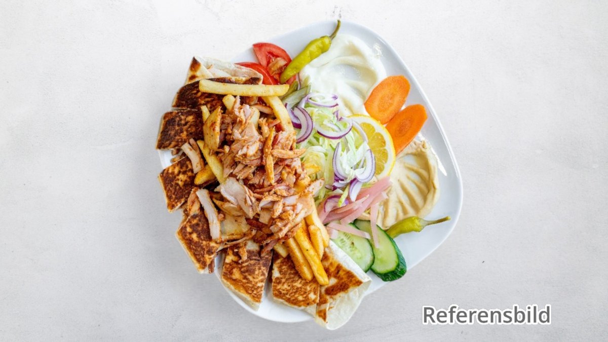 Pizza med kyckling, isbergssallad, färska tomater, gurka och blandad kebabsås.