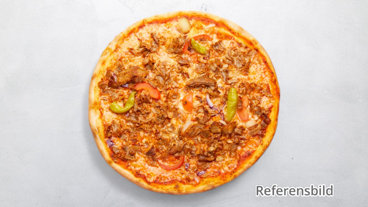 Pizza med kebabkött (nötkött), isbergssallad, tomater, gurka, feferoni, lök och kebabsås.