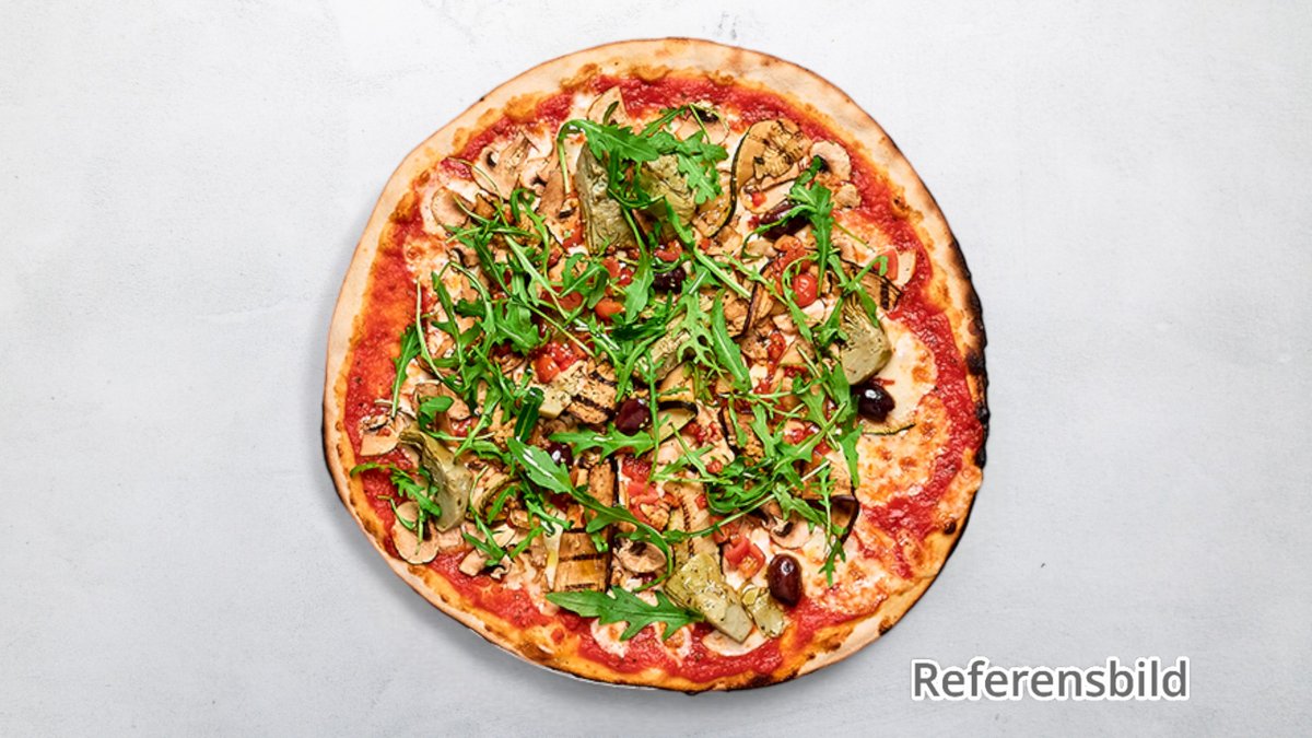 Pizza med grillade auberginer, zucchini, sparris, kronärtskocka, soltorkade tomater och ruccola.