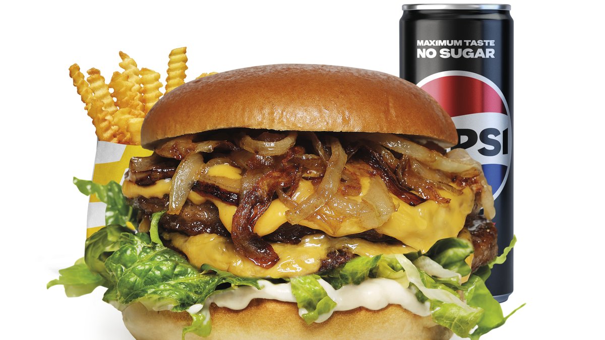 2x100 g smash burgare med smashdressing, gul lök, rostad lök och hamburgerost. Valfri dryck och pommez ingår.