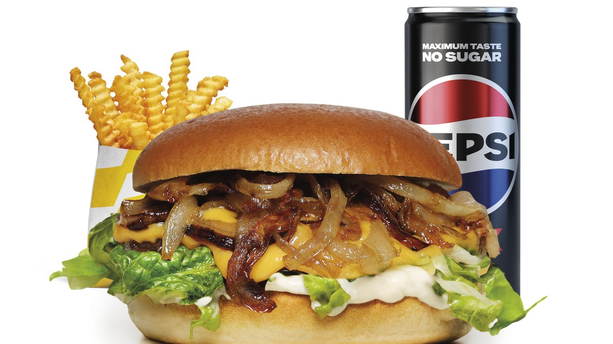 90 g burgare med ost, majonnäs, stekt lök och sallad i potato bun-bröd. Serveras med mellanpommez och en valfri 33 cl dryck.