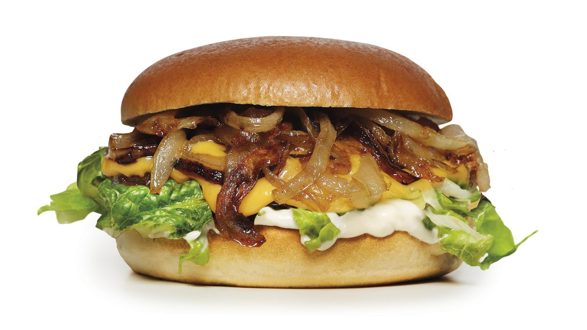 90 g hamburgare med ost, majonnäs, stekt lök och sallad i potato bun-bröd.