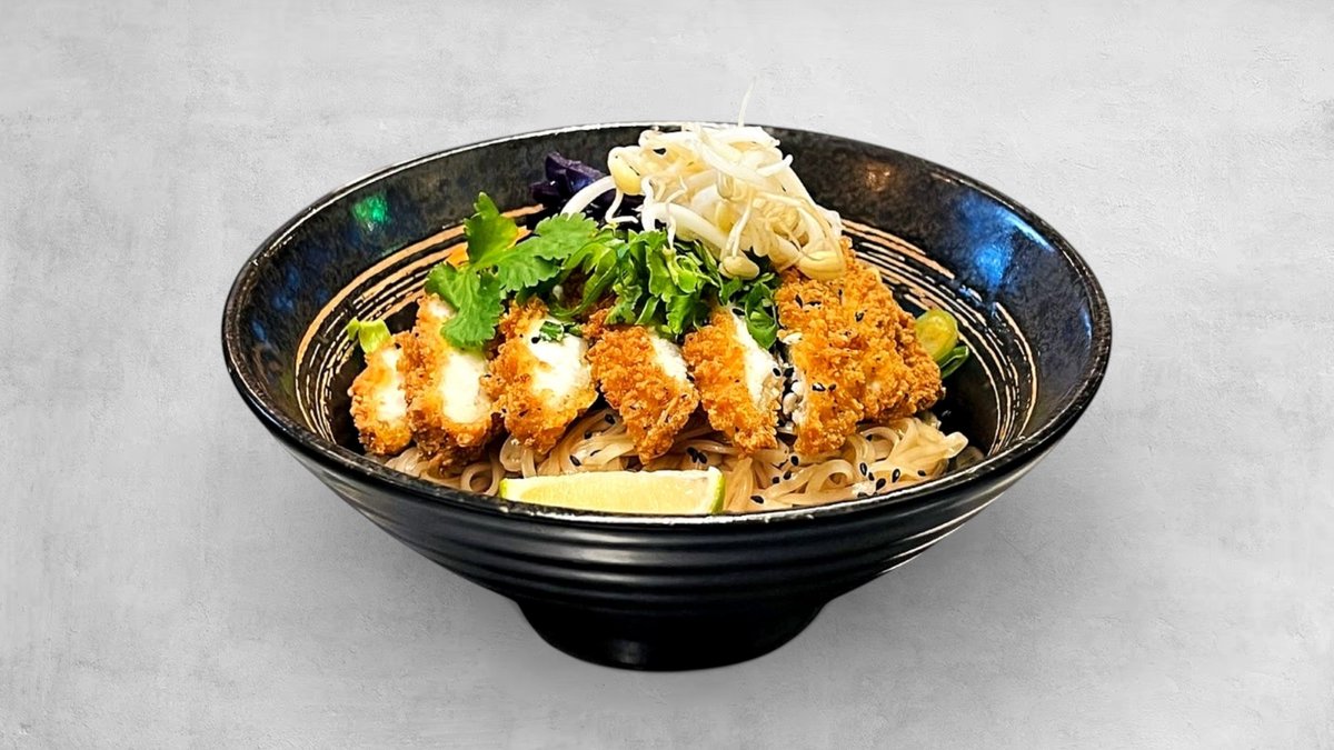 Mjuka risnudlar med grillad kyckling teriyaki i vår hemmagjorda sås, rostad vitlök, krossade jordnötter, koriander, salladslök, grönsaker, böngroddar och sesamfrön.