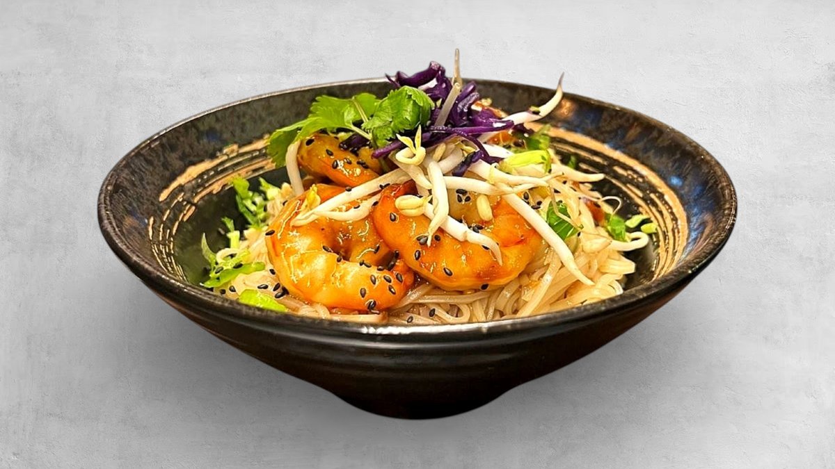 Mjuka risnudlar med stekta tigerräkor i vår hemmagjorda sås, rostad vitlök, krossade jordnötter, koriander, salladslök, grönsaker, böngroddar och sesamfrön.