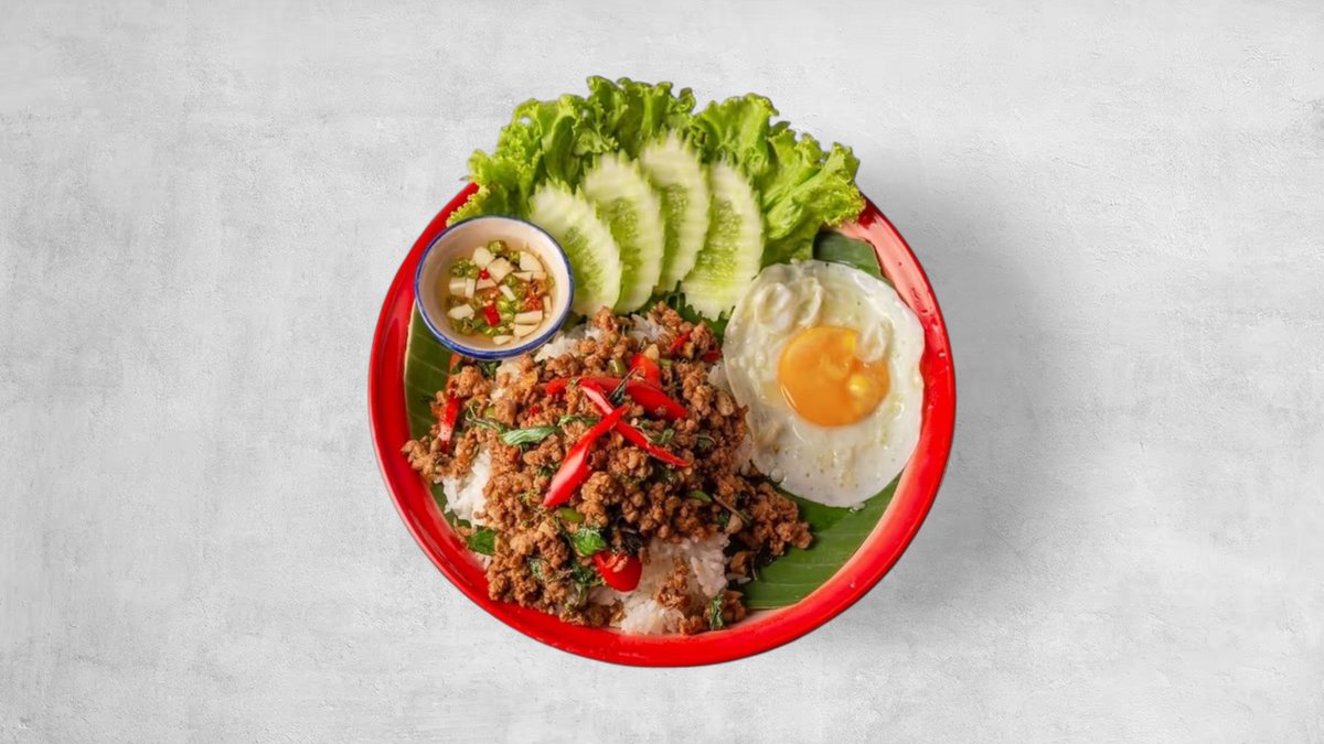 Thai street-food. Stekt fläskfärs med thai holy basilika, chili & vitlök, salladslök. Serveras med stekt ägg, gurka, ris & price num pal (chili fisksås).