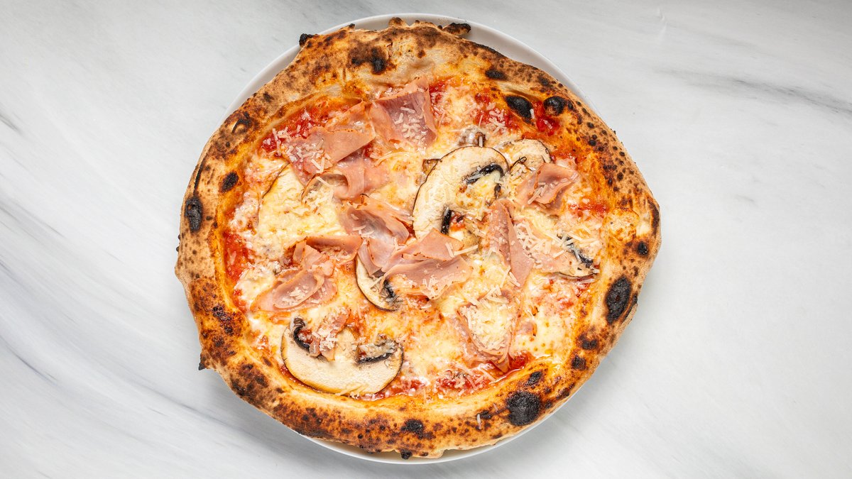 Tomatsås, ost och kokt italiensk skinka. Toppad med lufttorkad skinka, ruccolasallad och parmesanost. Inbakad.
