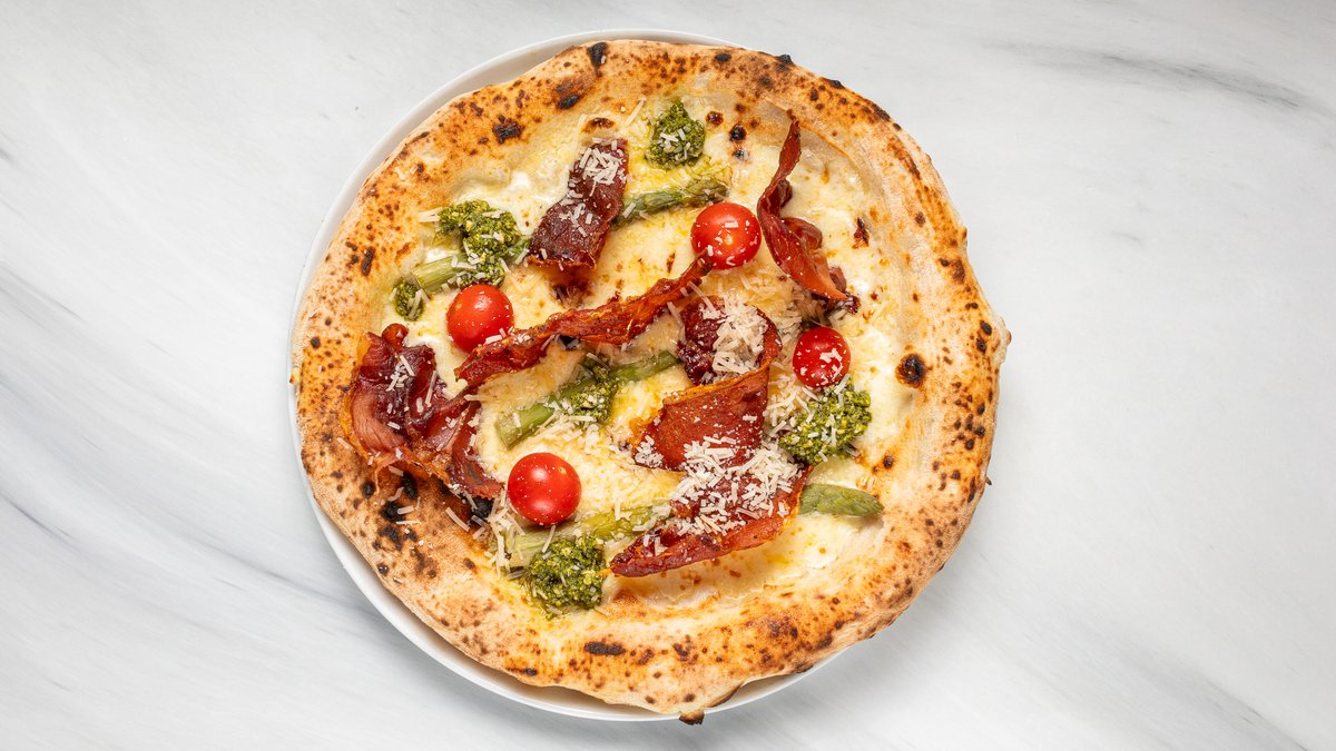 Tomatsås, ost, Pomodorini, mozzarellaost, pesto, speck affumicato och grillad sparris.