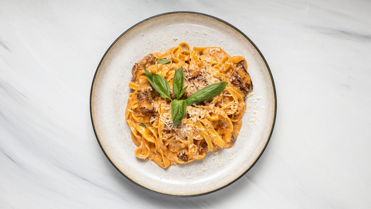 Pasta med kyckling, purjolök, soltorkade tomater, salvia, grädde och vitt vin.