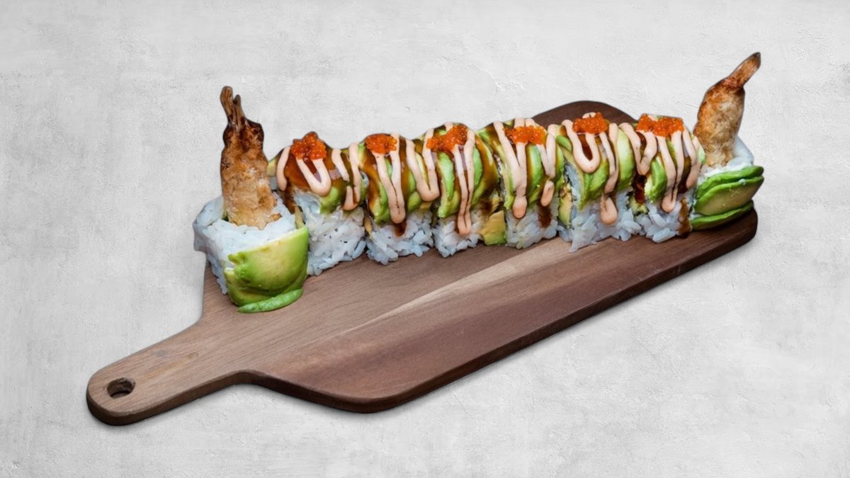 Fylld med friterade räkor och gurka. Toppad med philadelphiaost, avokado, kimcheemajo, teriyakisås och rom. Miljöcertifierad fisk.