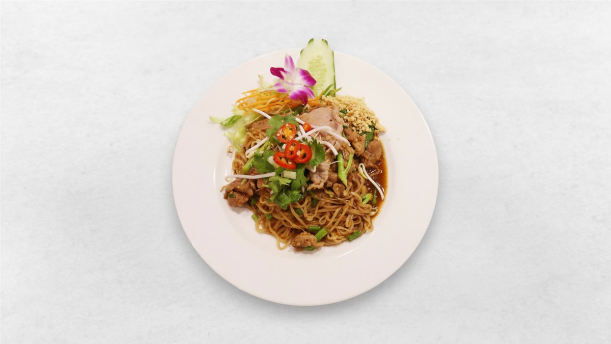 Stekta risnudlar med chili, vitlök, hackade jordnötter, groddar, salladslök, grönsaker och koriander.