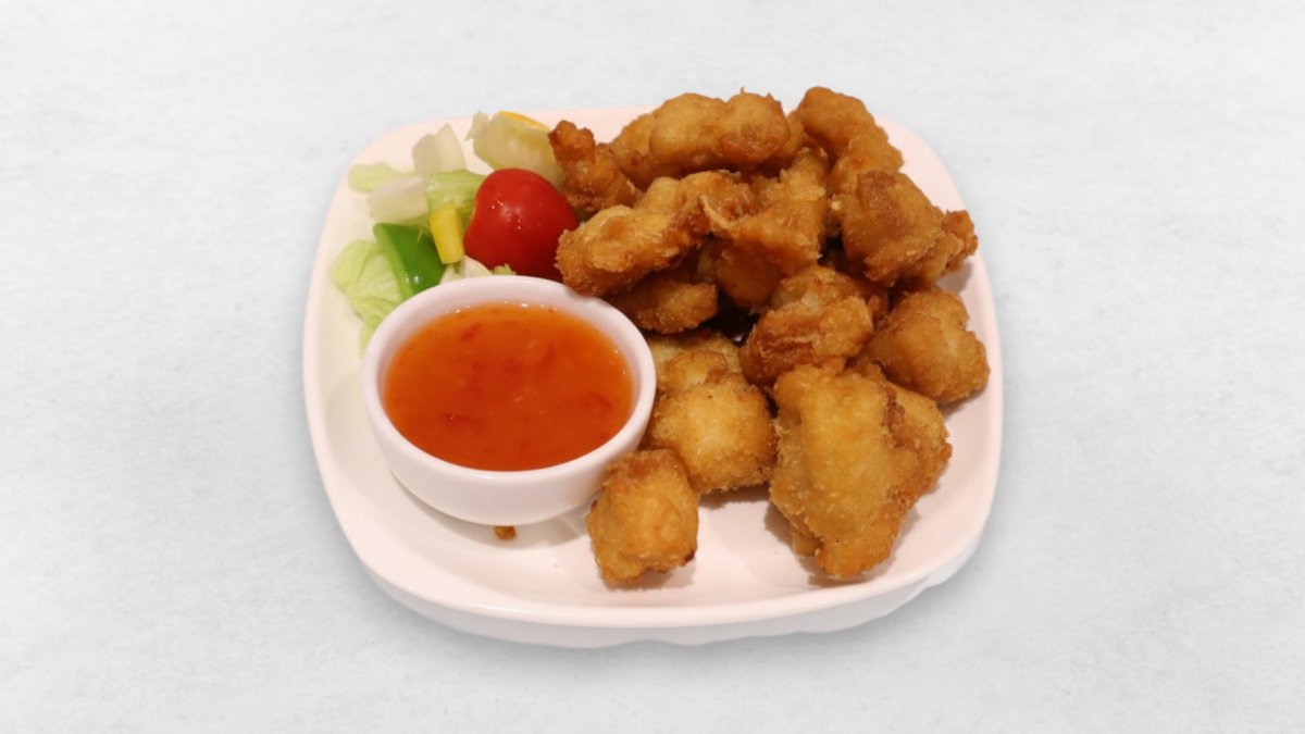 Serveras med fisk, skaldjurskakor och sweet chilisås.