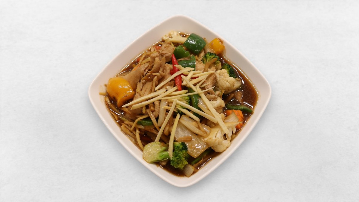 Wokade ingefära med ostronsås, broccoli, blomkål, vitlök, lök och paprika.