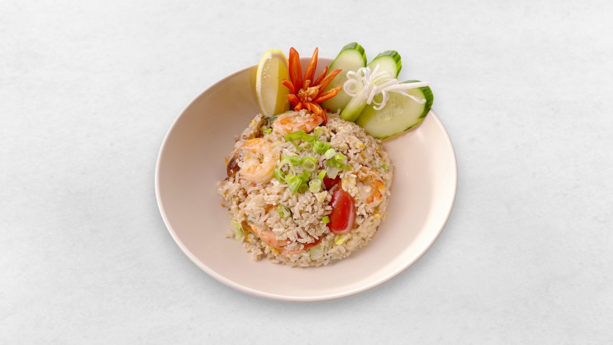Stekt ris med grönsaker, vitlök, lök, morot, ägg och kryddor.