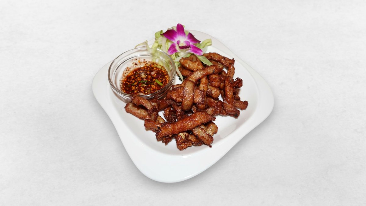 Friterade special marinerat lufttorkat fläskkött. Serveras med wokade grönsaker och ris.