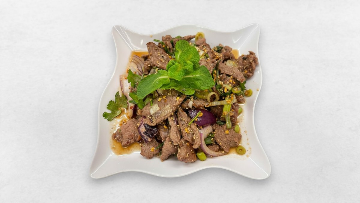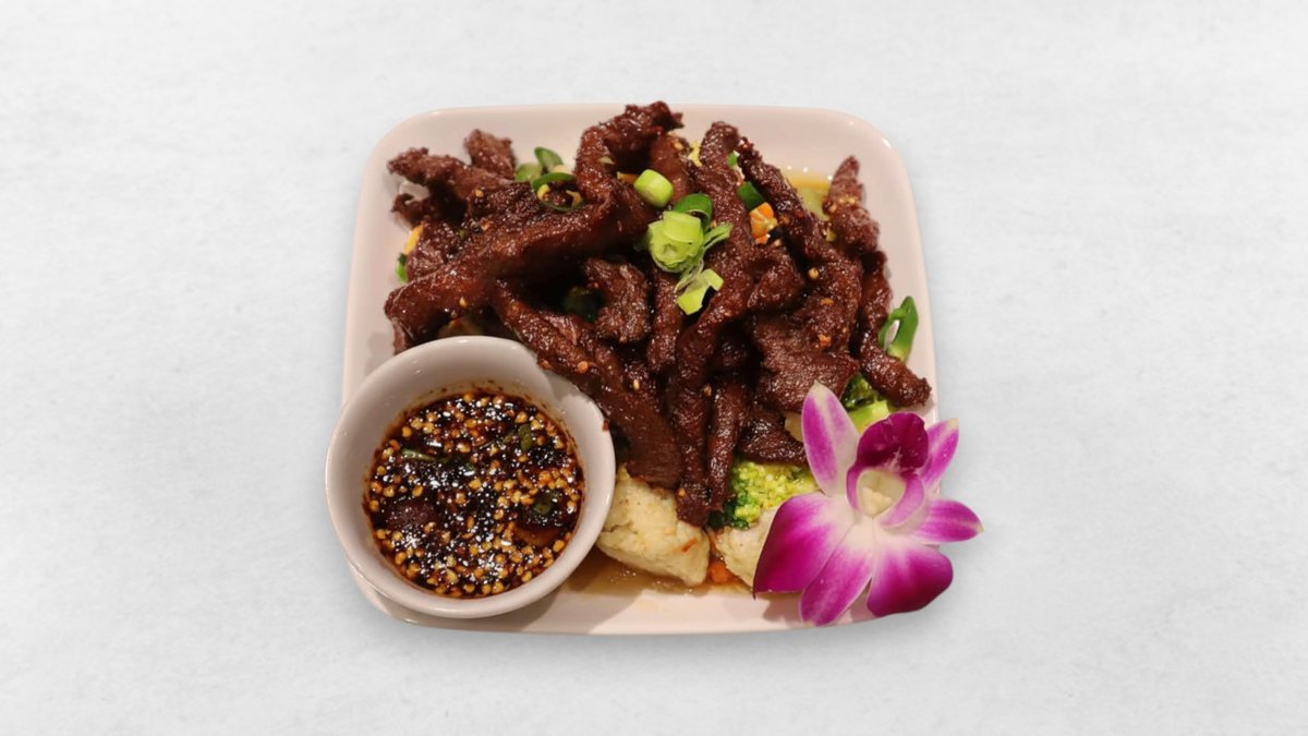 Friterade special marinerad lufttorkat nötkött. Serveras med wokade grönsaker och ris.