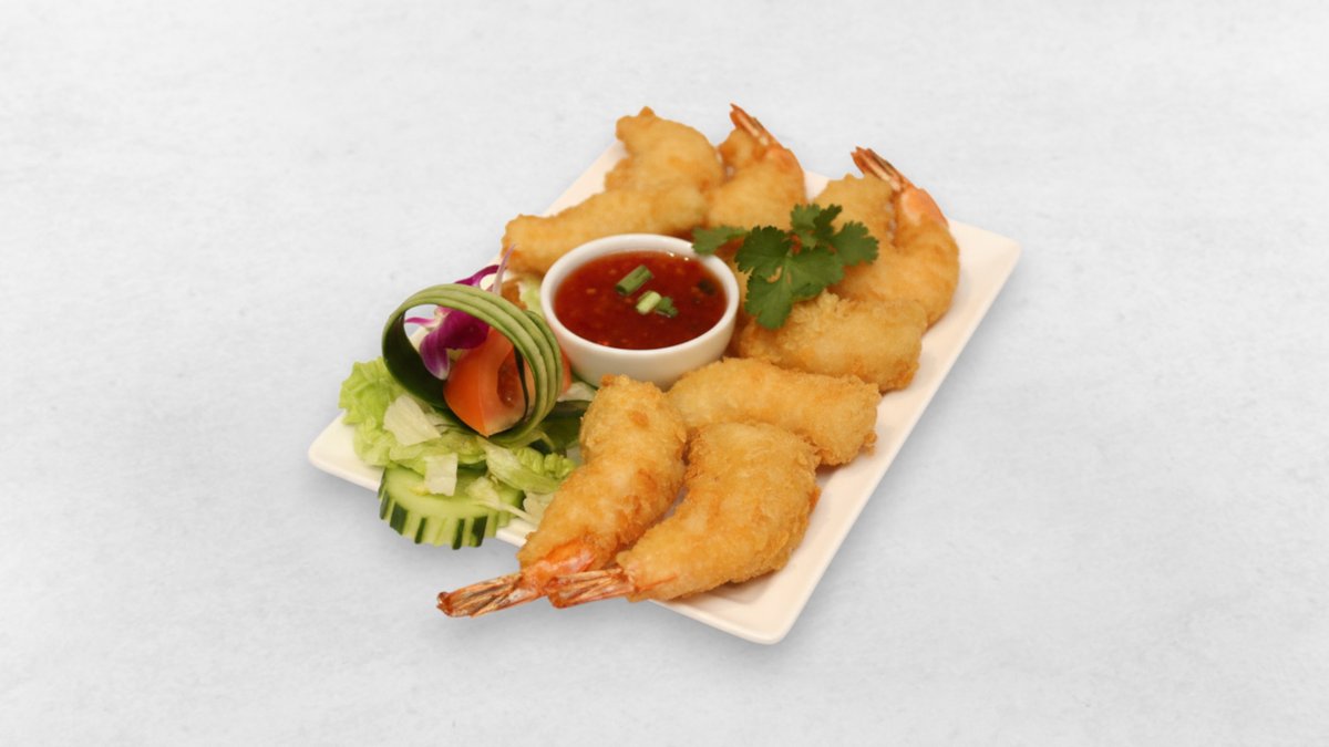 8 st marinerad panerade stora räkor med sötsursås och ris.