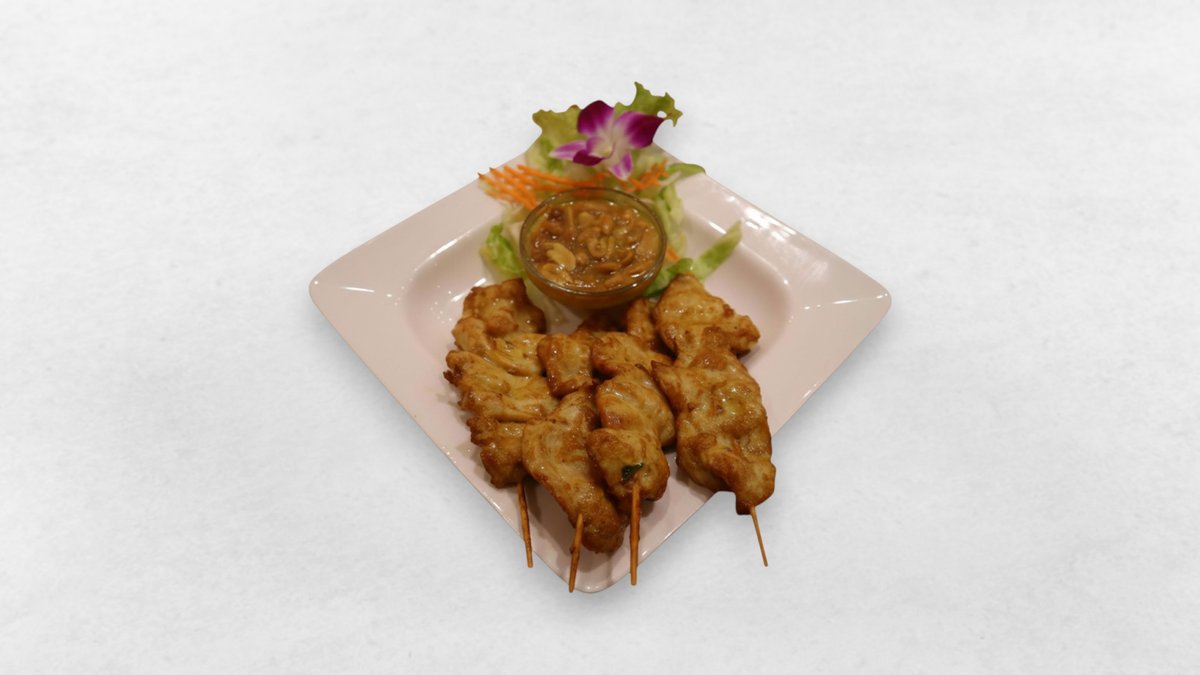 4 st friterade marinerade kycklingspett med hemlagad jordnötssås och ris.
