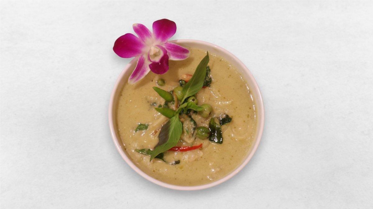 Grön curry gryta med kokosmjölk, aubergine, bambu, paprika, lök och Thaibasilika.