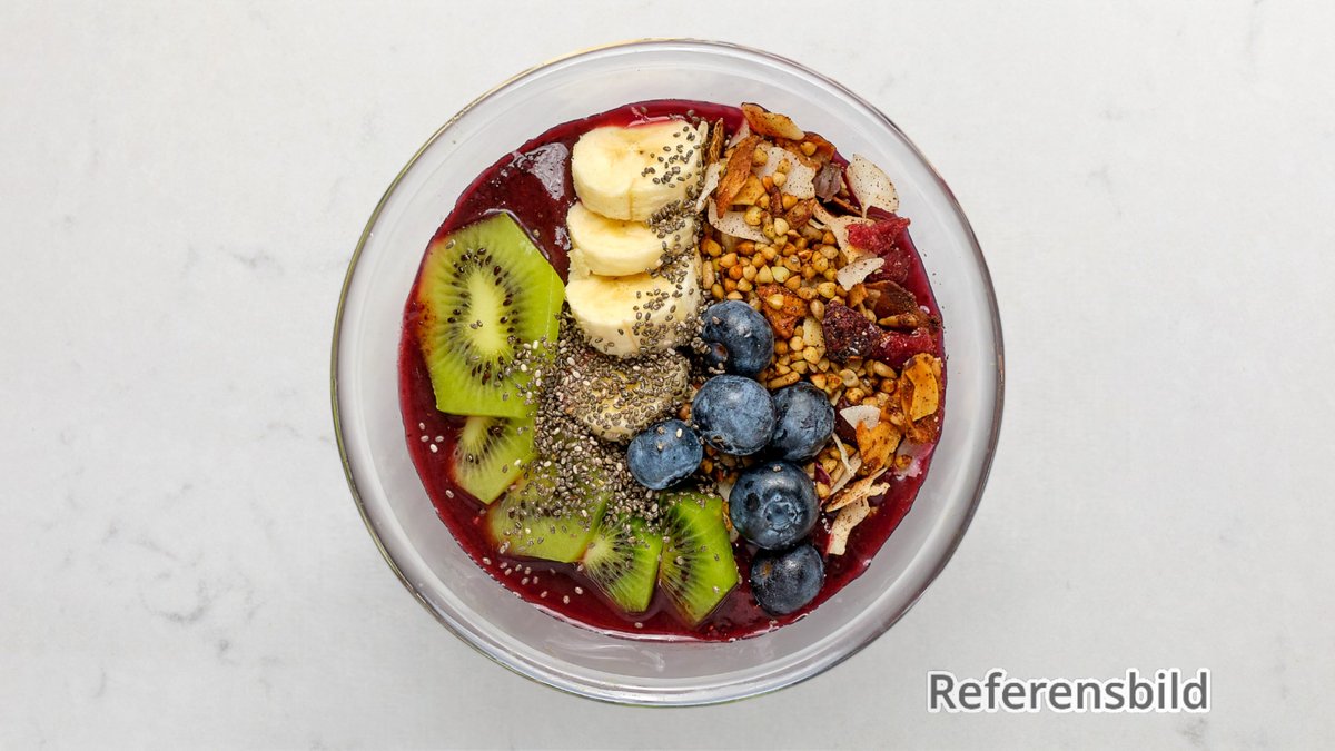 Serveras med granola, blåbär, banan och jordgubb. Toppat med kokos och mandel.
