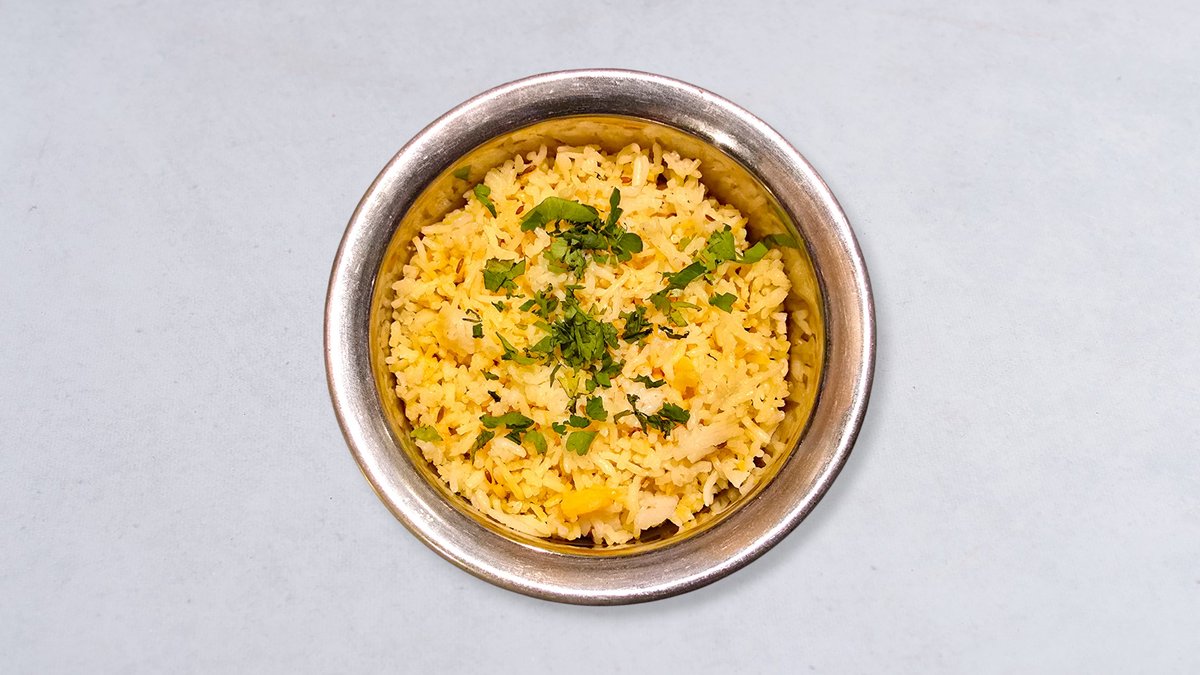 Tärningar av kyckling, örter och kryddor tillagade i lök- och tomatsås. Serveras med pulao ris.