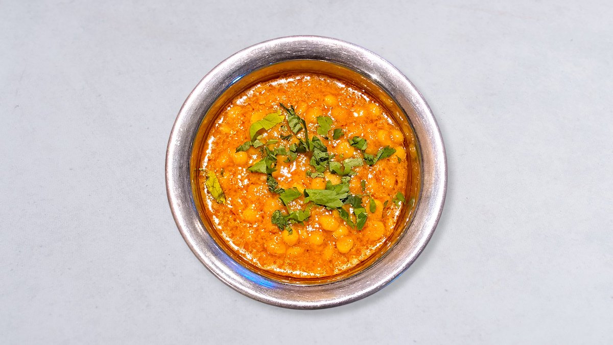 Kikärtor, tillagade i en lök- och tomatsås. Serveras med pulao ris.