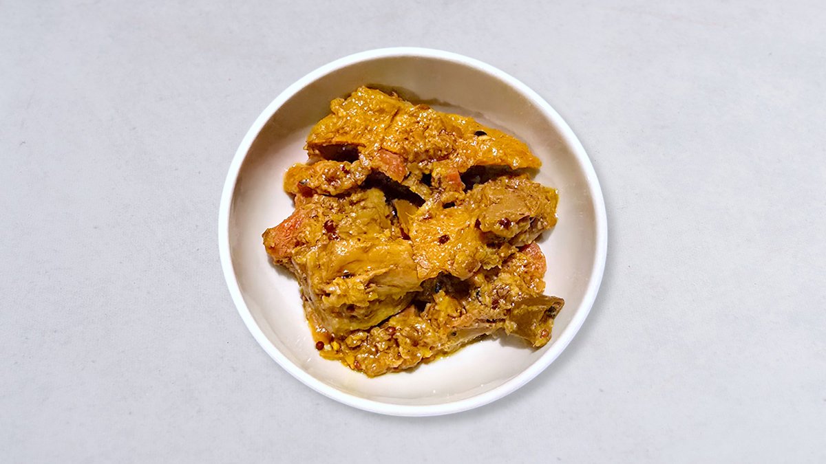 Tärningar av kyckling tillagade i en currykryddig sås.