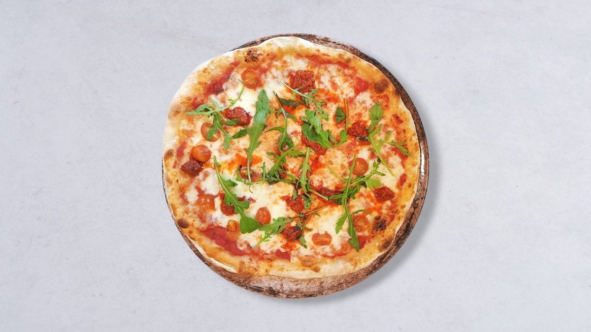 Pizza med tomatsås, mozzarella, sobrasada och ruccola.