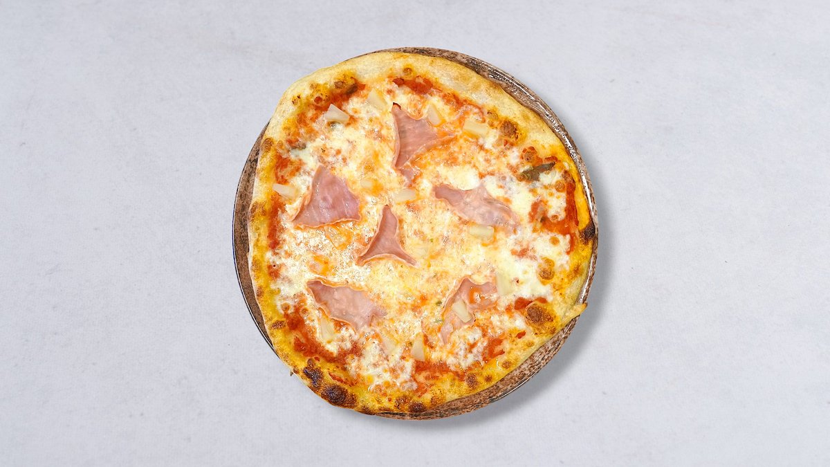Pizza med tomatsås, mozzarella, skinka och ananas.