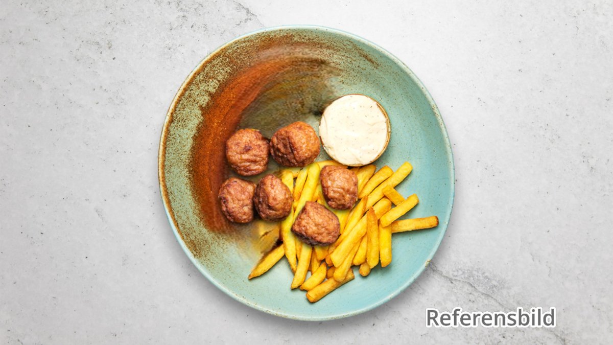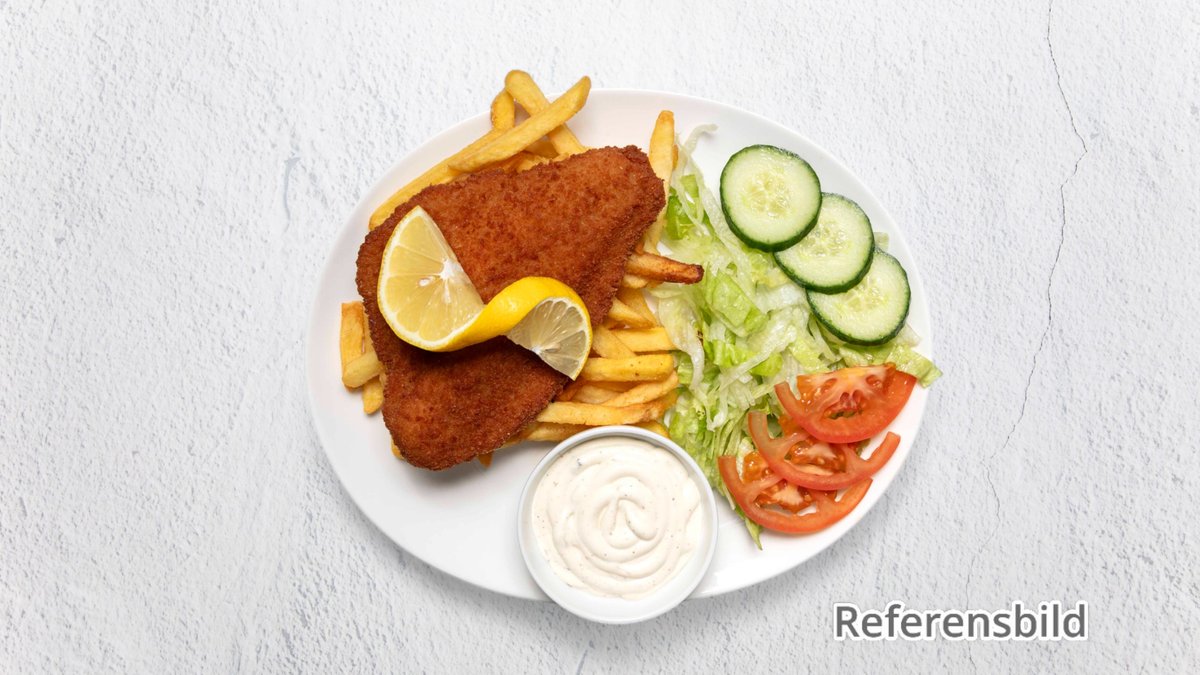 Serveres med pommes frites eller stekt potatis.