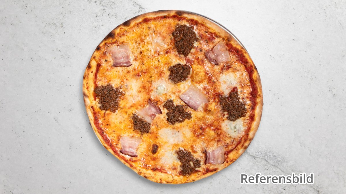 Pizza med skinka, salami, bacon, köttfärs och lök.