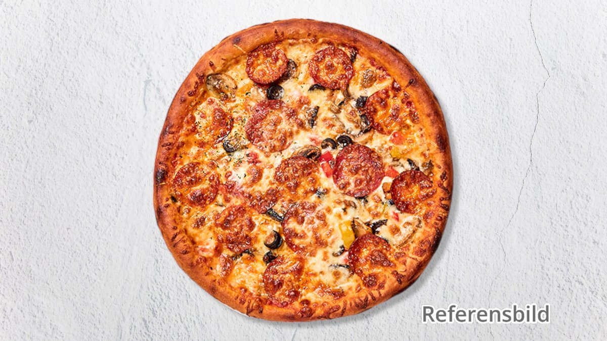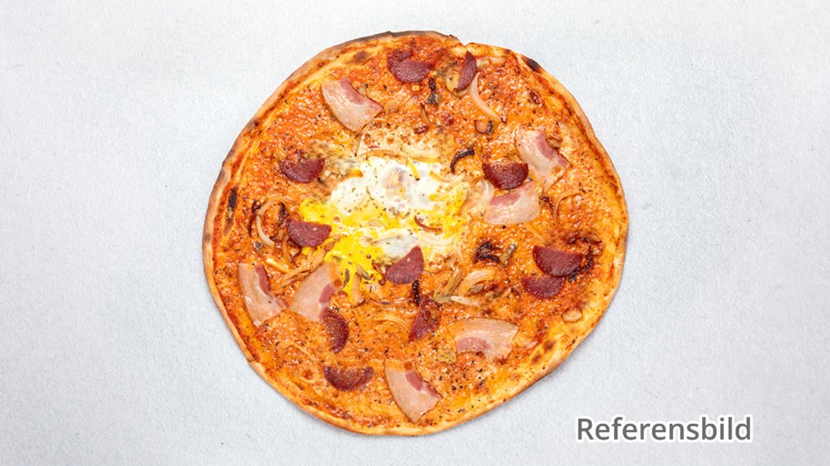 Pizza med skinka, champinjoner, bacon, salami och lök.