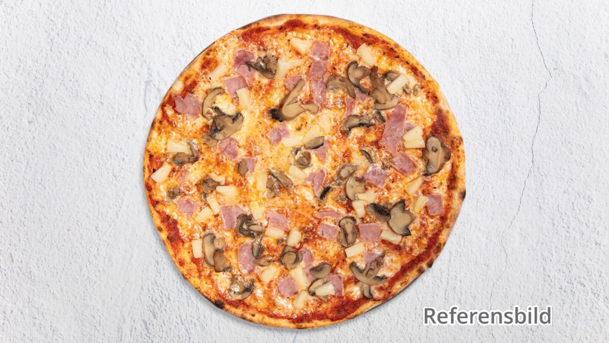 Pizza med skinka, champinjoner och ananas.