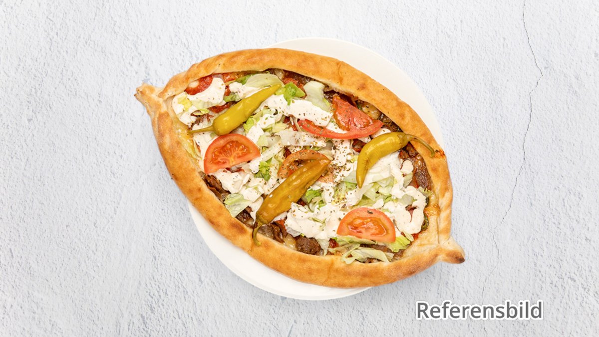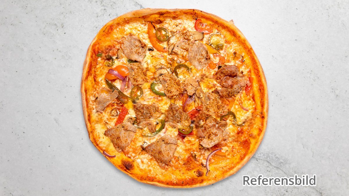 Pizza med skinka, kebab, lök, fefferoni och sås.
