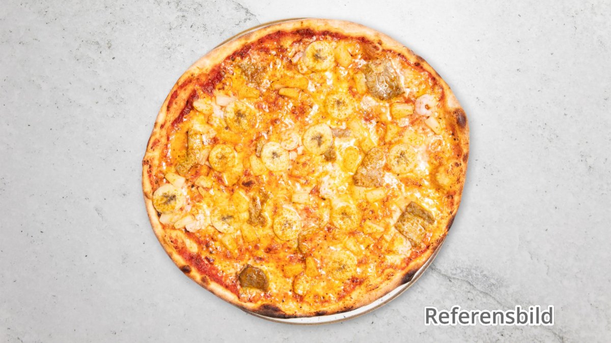 Pizza med skinka, curry, banan och ananas.