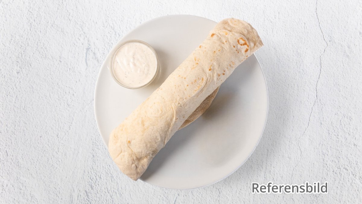 Gyro med hembakat bröd och kött.