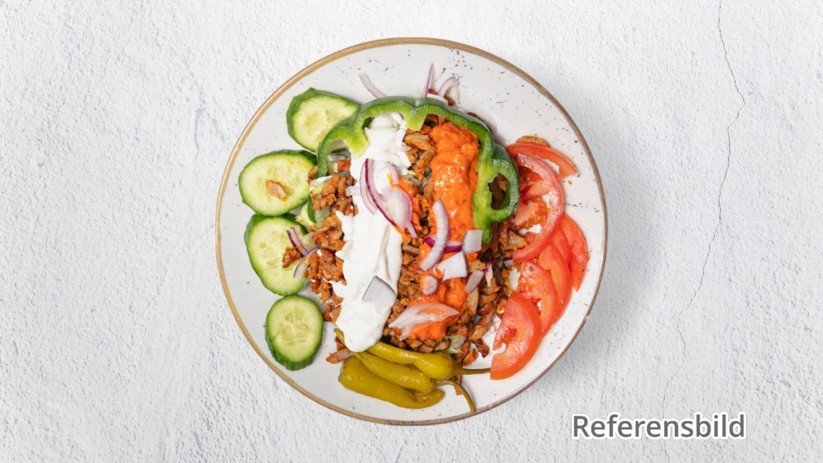 Serveres med sallad, tomat, gurka, pommes frites eller ris och sås.