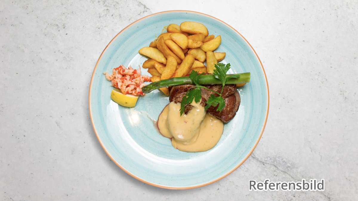 Serveres med pommes frites eller stekt potatis och bearnaisesås.