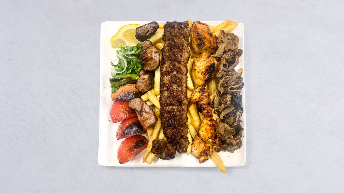 Kebabspett, kycklingspett, lammspett, bröd, grillat kött, grillad tomat, citron, lök, persilja och vitlökssås.