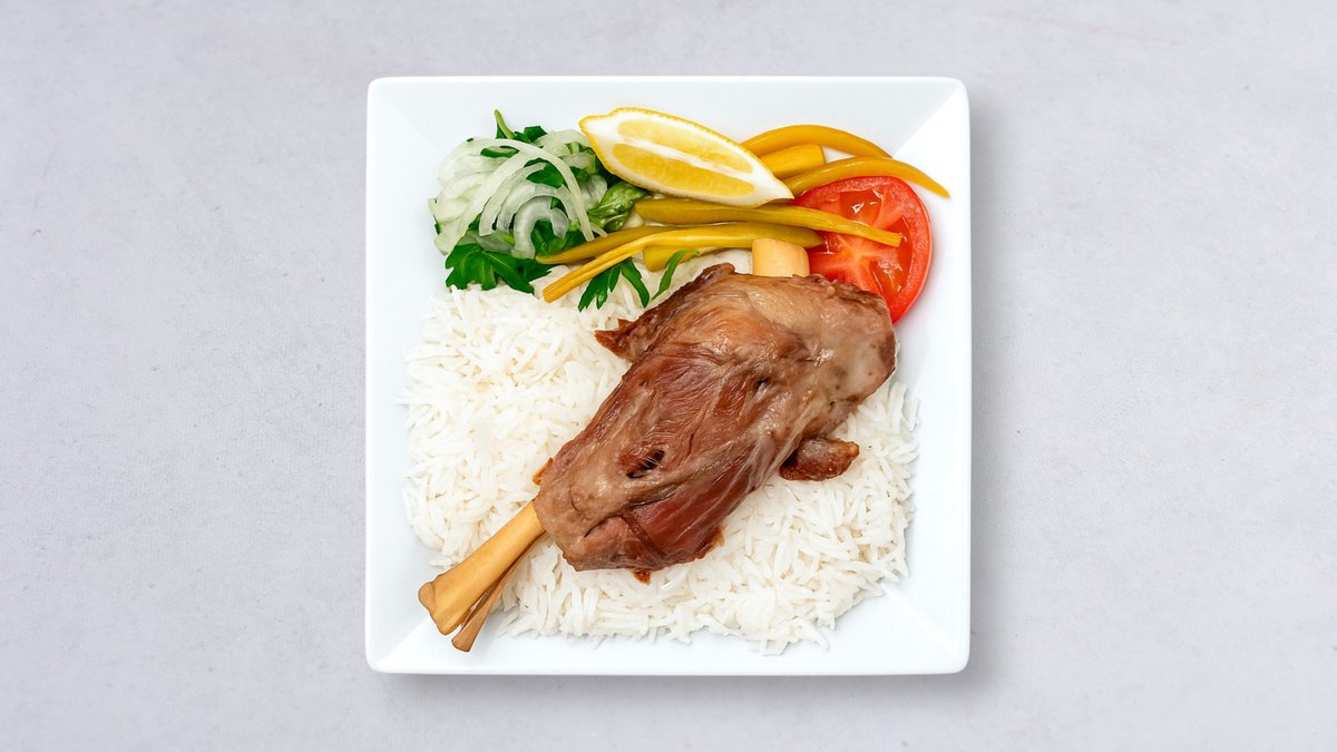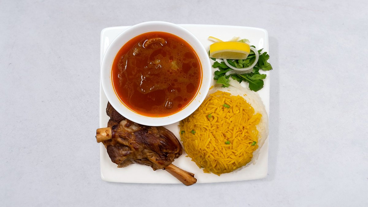 Lammkött, bröd, grillad tomat, citron, lök, persilja och vitlökssås.