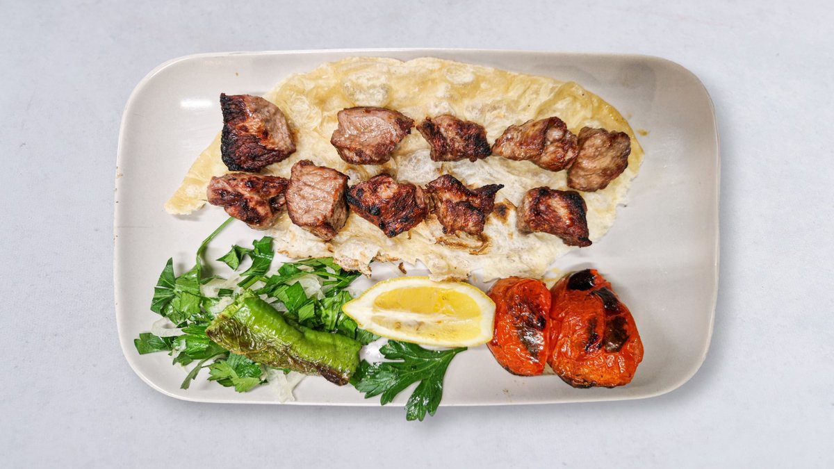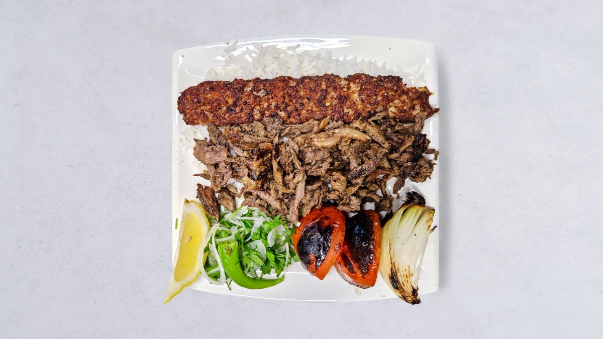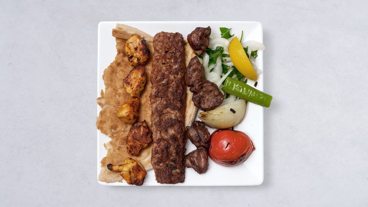 Köttfärsspett, lammkött, bröd, grillad tomat, citron, lök, persilja och vitlökssås.
