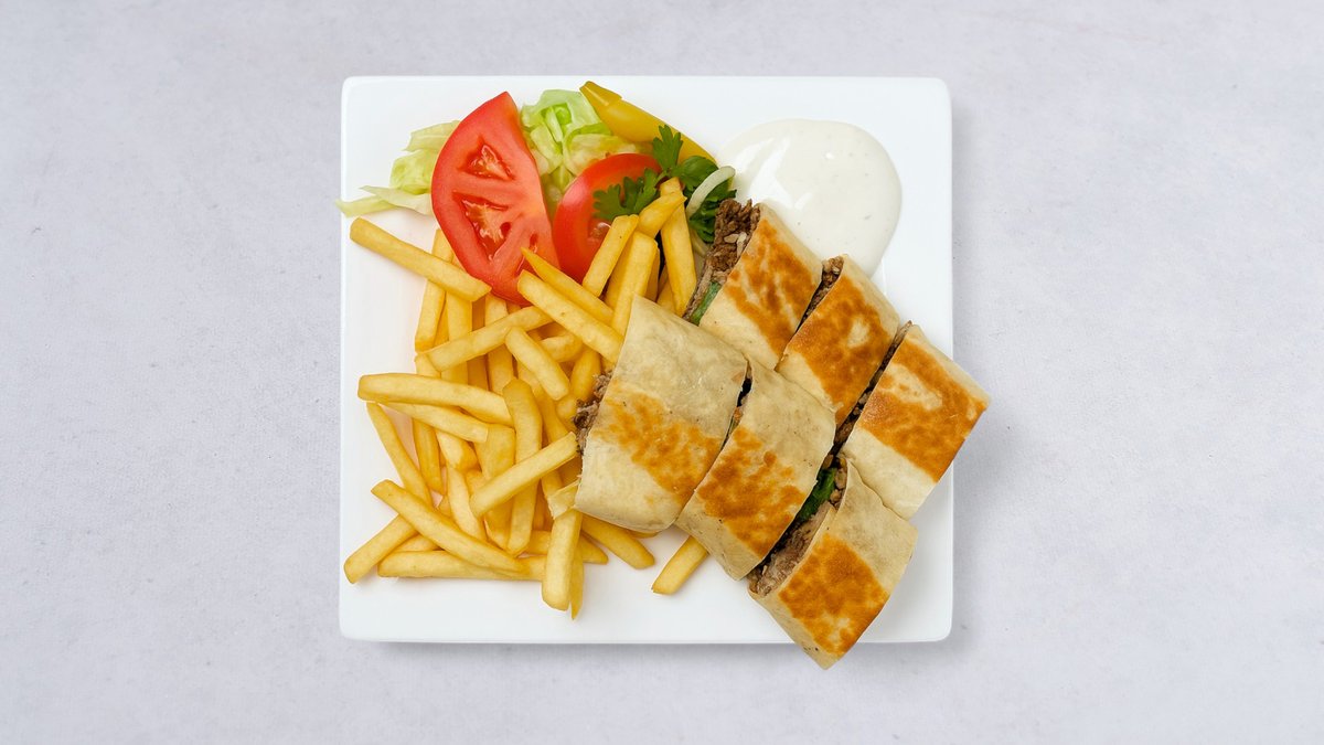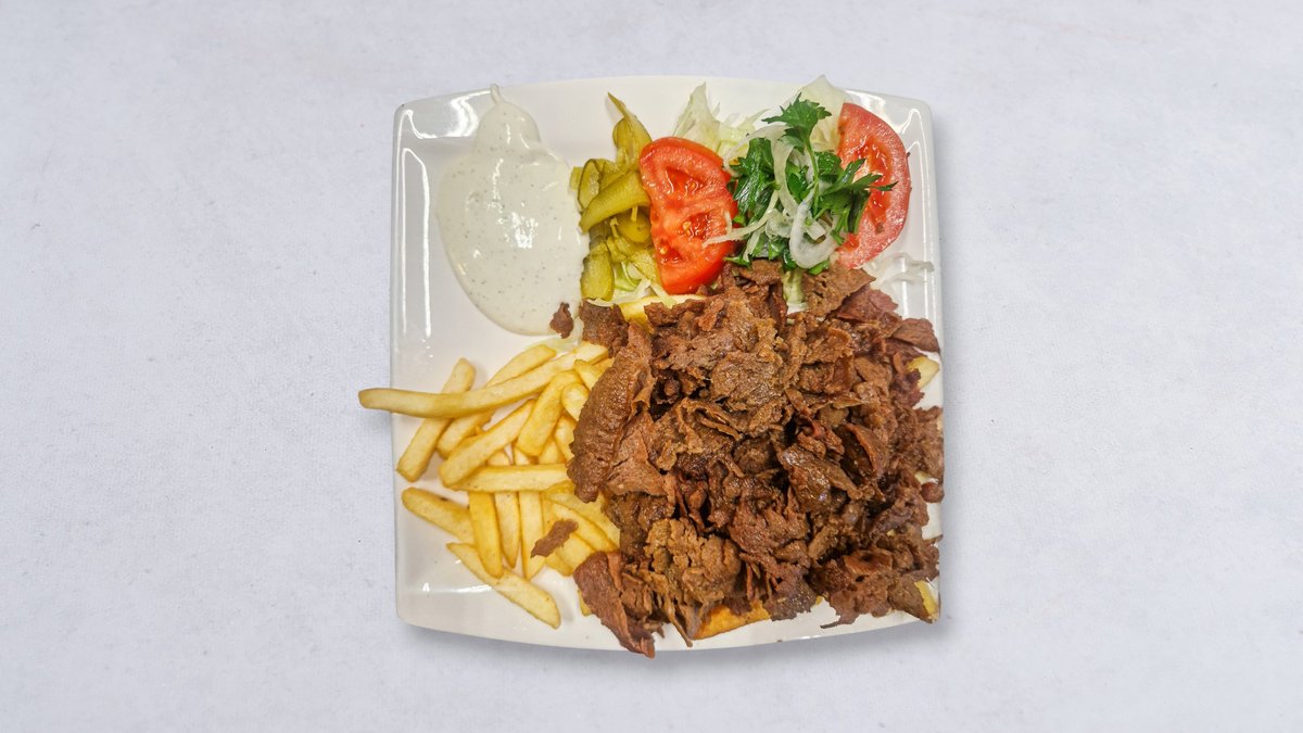 Kebabkött, pommes, tomat, isbergssallad, citron och vitlökssås.