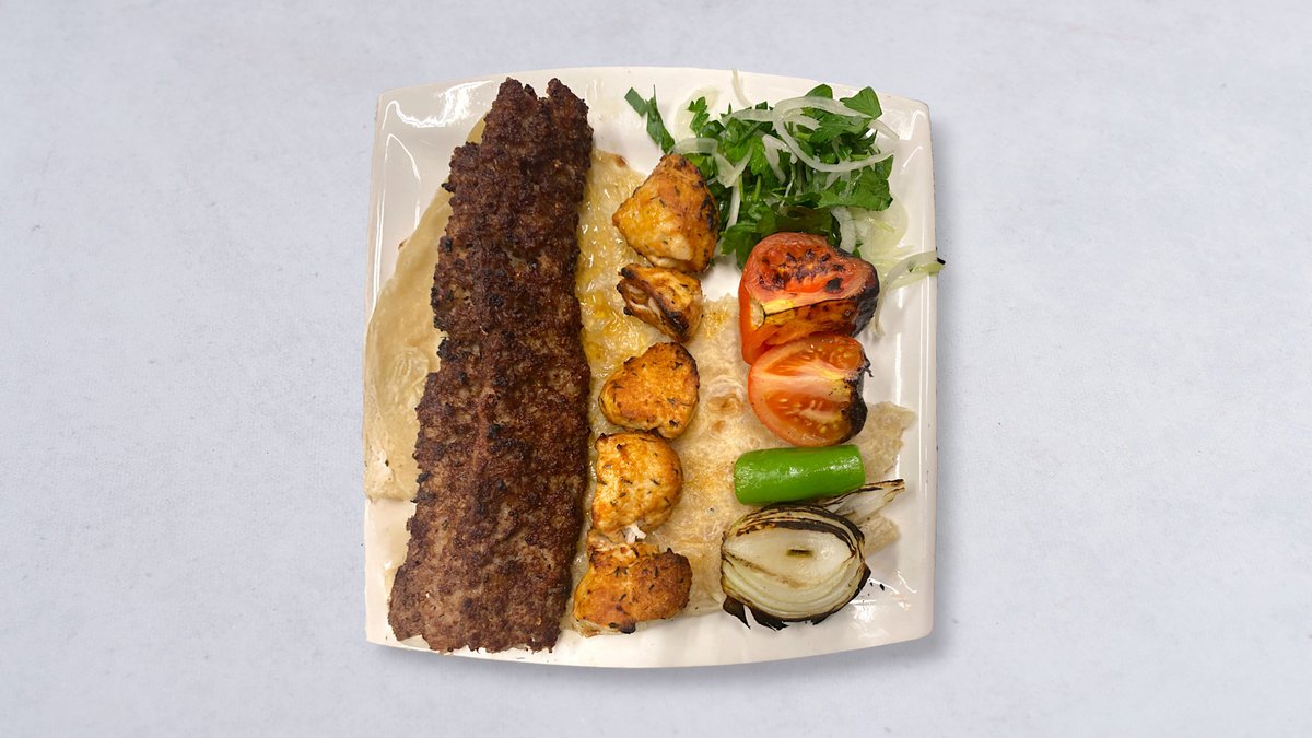 Lammfärsspett, kycklingspett, bröd, grillad tomat, citron, lök, persilja och vitlökssås.