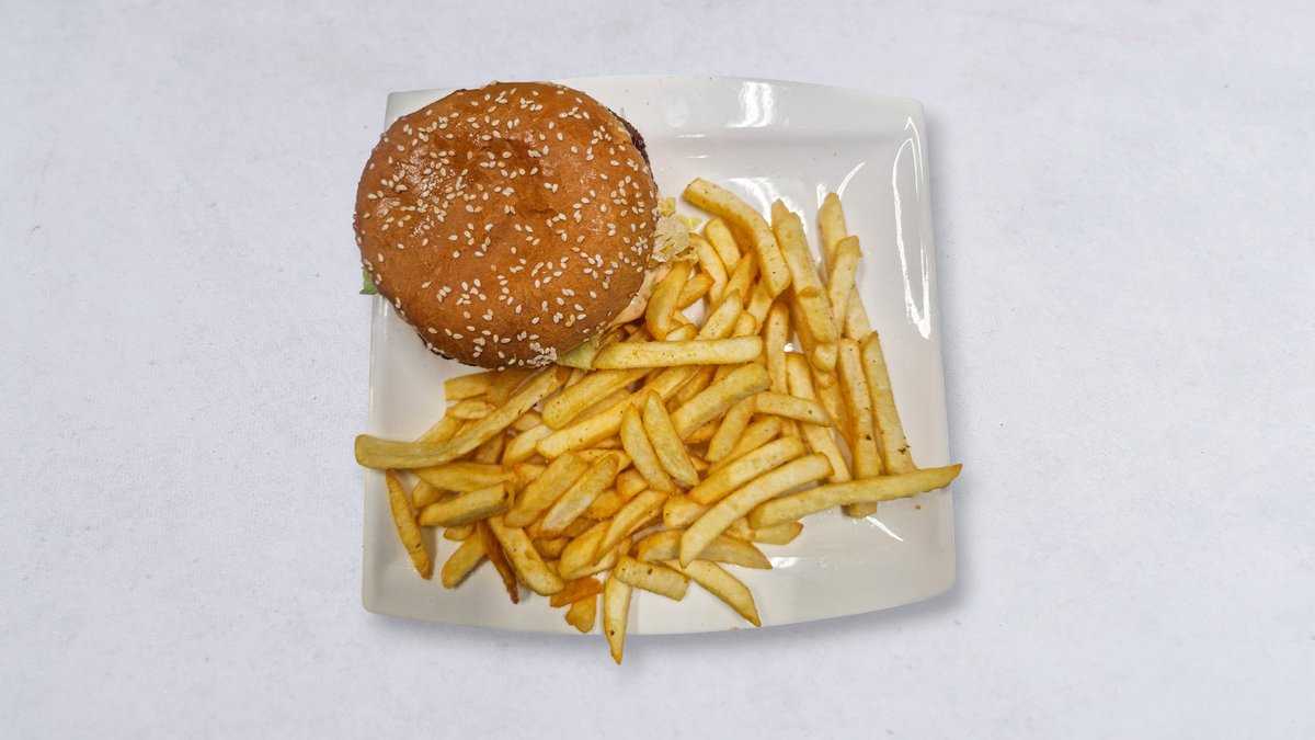 90g hamburgare, pommes frites och vitlökssås.