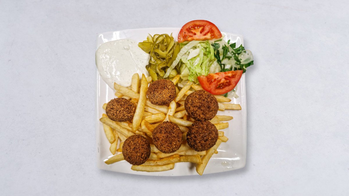 Falafel, isbergssallad, tomat, lök och vitlökssås.