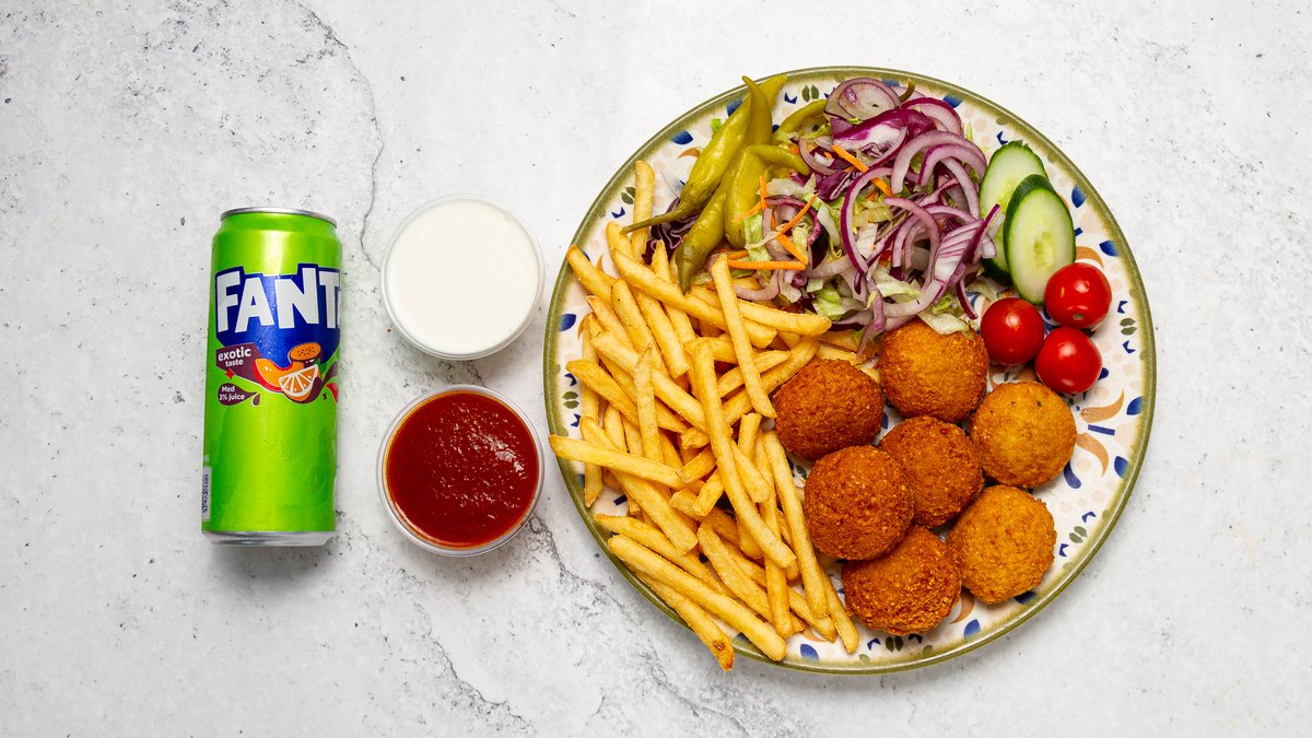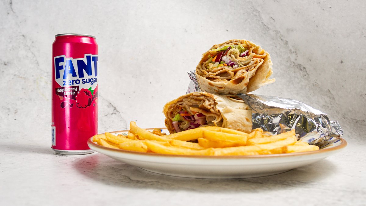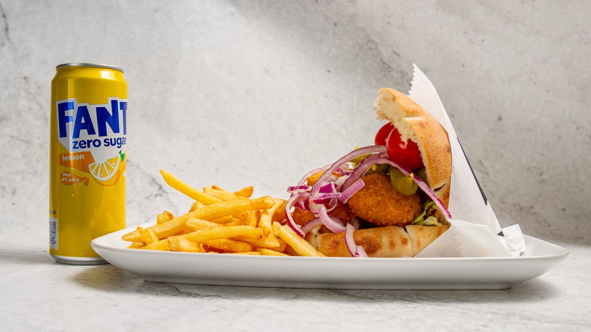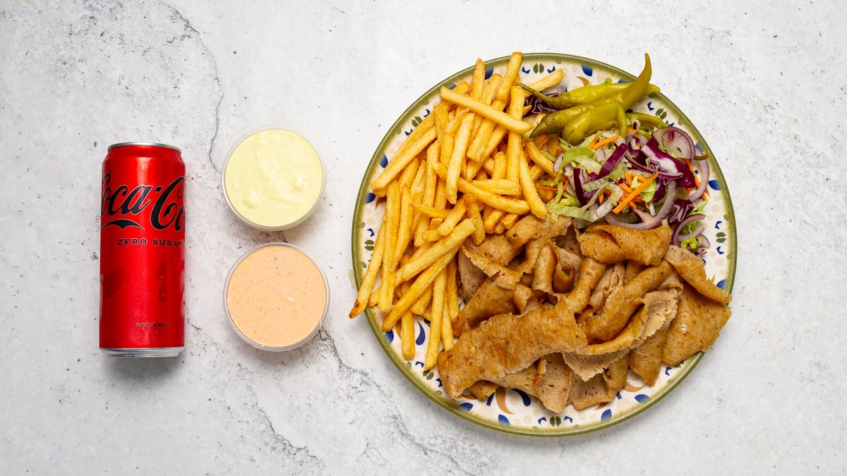 Välj mellan pommes eller ris. Isbergssallad, tomat, gurka, lök, fefferoni och valfri sås ingår i alla rätter.