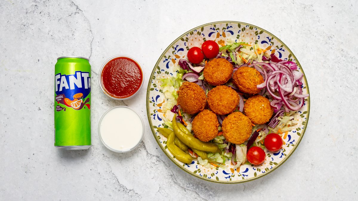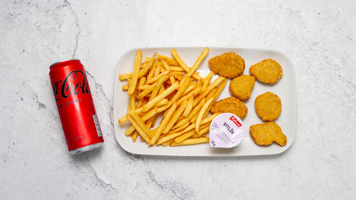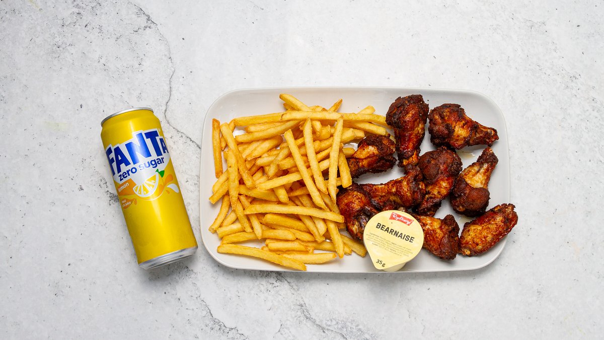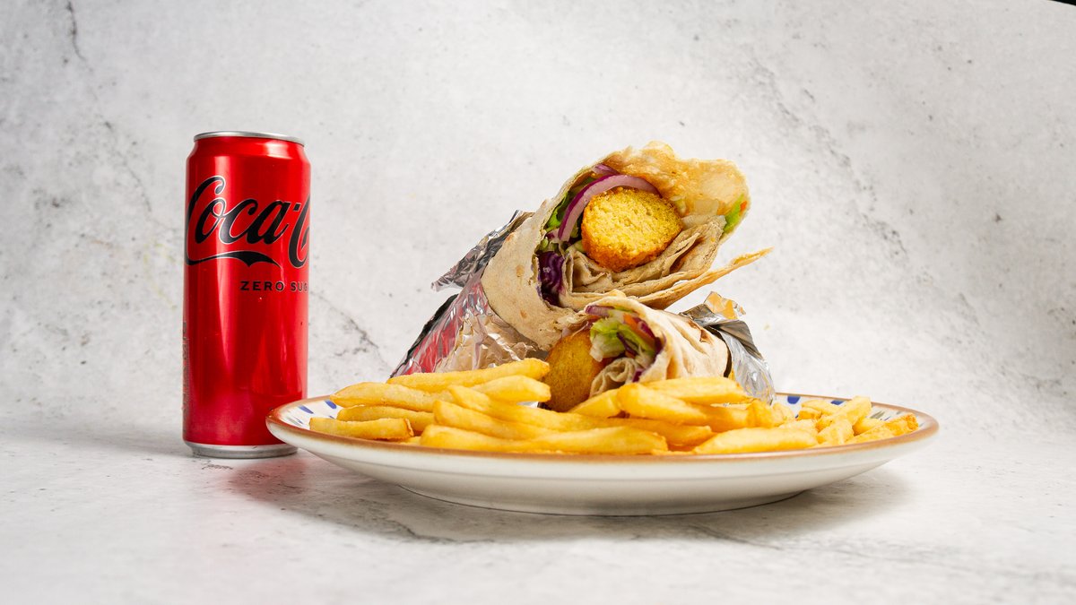 Välj mellan pommes eller ris. Isbergssallad, tomat, gurka, lök, fefferoni och valfri sås ingår i alla rätter.